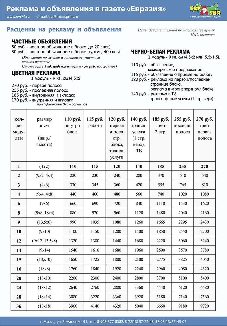 Заявку на модульную рекламу (с указанием ваших реквизитов) высылайте на evr@miassprint.ru